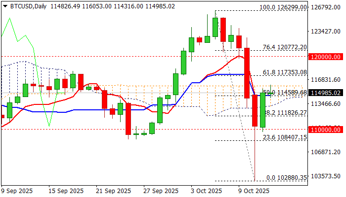 A daily close above both the 55-day moving average and the 50% retracement of the 126299–102880 decline (114330/114589) is needed to confirm the bullish momentum. A sustained move above the cloud top would reinforce the signal and open the way toward 117353 (Fibo 61.8%) and the psychological 120000 level.