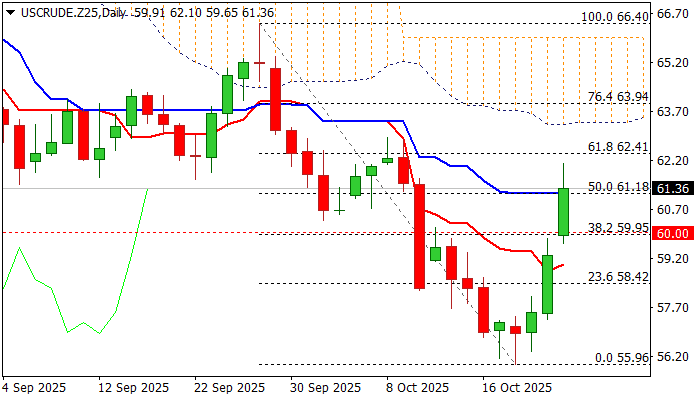 Bulls are now testing immediate resistance levels at $62.26/41 (55-day moving average / 61.8% Fibonacci retracement), with a more significant barrier at the base of the daily Ichimoku cloud ($63.32–$65.97). A sustained break above this zone is needed to confirm a stronger bullish reversal; otherwise, the recovery may stall and turn into a corrective phase within the broader downtrend.