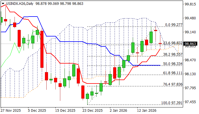 The fading bullish momentum, combined with declining RSI and Stochastic readings on the daily chart, points to further easing. Stochastics also showed a bearish divergence, signaling a stall in the recent rally. In addition, a double bull-trap near the $99.20 Fibonacci resistance adds to downside risks. However, sustained weakness needs to clear key support at the $98.83/$98.73 zone (Fibonacci 23.6% retracement of the $97.39/$99.27 range, daily Tenkan-sen, and cloud base) to validate the signal and trigger fresh downside acceleration. The next Fibonacci supports lie at $98.55 (38.2%), $98.33 (50%), and $98.11 (61.8%).